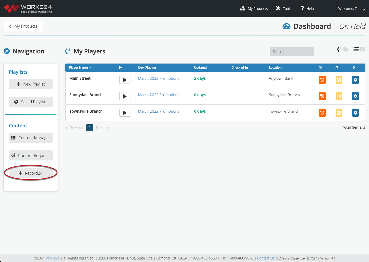From the Portal Dashboard, go to On Hold Messaging > My On Hold Players. Click the Record24 button at the bottom of the menu on the left.